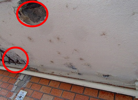 この部位の横に走ったひび割れから雨水が侵入した原因の1つ