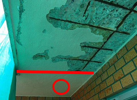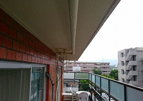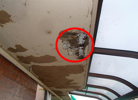 分譲住宅で5Fの施主様から管理組合の方にお問い合わせがあり、天井が浮いていて落ちてきそうだとの事でした。現調した所を過去に改修工事として手は加えられていた様に見えましたが、表面的であり屋上も見たところ防水処理の施工がひどく、予測ではありますが(見た目は防水処理されている為、目視では確認できず)屋上の何処からか水の経路があり、数年にかけて少しづつ5F天井の内部に侵入し、今現在の状況まで痛めてしまった様です。因みに過去の改修は6年前との事でした。