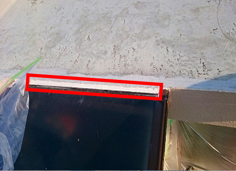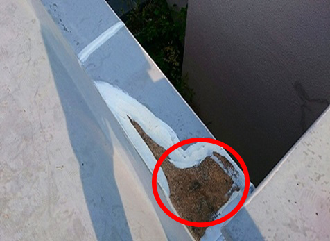 屋上庇天端 過去修善時膜板出隅、転端の取り合い部にクロスメッシュ補強し防水を巻いているがメッシュが透けて亀裂が見えていた。