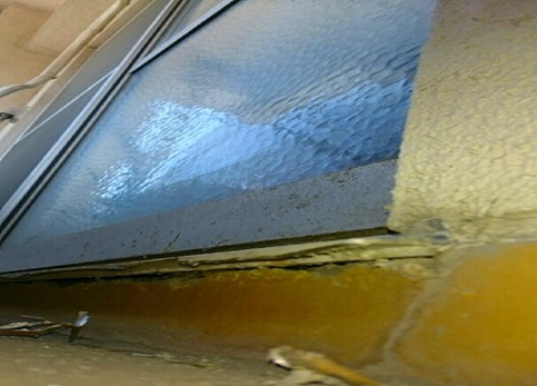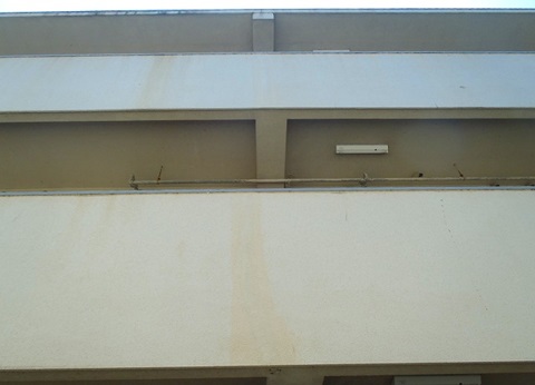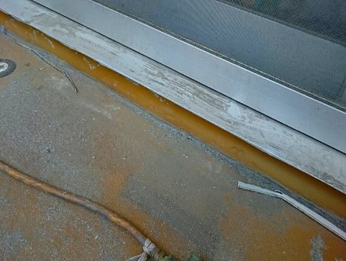 3F建て9世帯のマンションで(築40年くらい)3F〜2Fの世帯の天井に水が流れてくるとの事で、調査したところベランダ掃き出しサッシ水切り下部と巾木立ち上がりの入隅に隙間が出来ており、叩き付けられる雨の時や洗濯機の排水が巾木側に向いていた時に現象がありまず間違いなく、そこが原因で漏水していましたので部分改修工事として施工しました。共用部笠木はひび割れも多く、水の侵入もあったので工事しました。