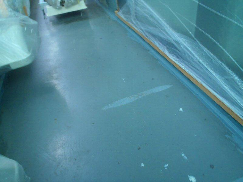 ベース材(サラセーヌC)はある程度勾配に沿って流れながらレベリングする材料なのでドレンを密封養生し勾配を確認しながらたっぷりとベース材を塗布します。